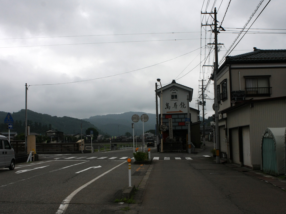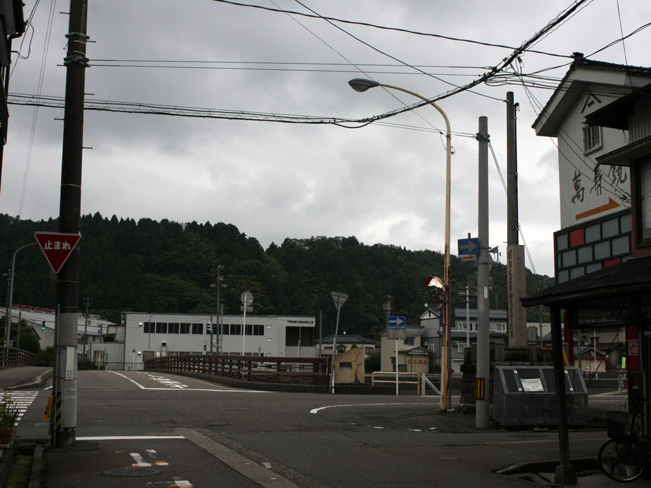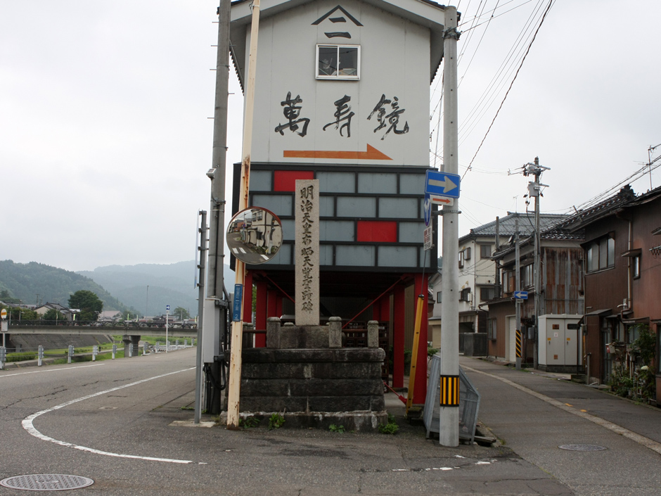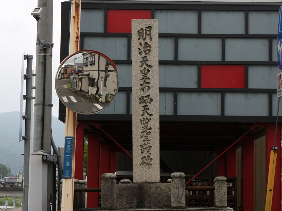 明治十一年秋 明治天皇北陸に巡幸あらせられ九月二十一日我が加茂川の大橋を過ぎさせ給ふ時に地方民は産業の実状を天覧に供し奉らんことを希ひ布晒業坪谷善四郎等をして橋の上流に於て作業せしむ此日快晴橋上の御馬車より龍韻麗しく欒ばし給いて即日作業者に金一封を賜ふ爾来星霜五十九年当時の聖蹟漸く失はれんとするを憂へ加茂町の有志関真次郎自ら資を献じ町の事業として碑を大橋の畔に樹て以て盛事を不朽に傳へんことを請う町議其諮を容れて之を実行す乃ち謹んで其由来を記して碑陰に刻すと云爾<br>