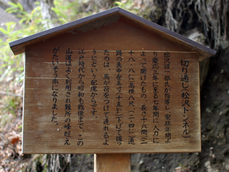 Monument切り通し(松沢トンネル)<br/> 松沢語一郎氏が指導し、安政年間より慶応3年に至る7年間に、人力によって開けたもの、長さ16間(28.8m)、高横8尺(2.4m)、通路の真中を5寸(15cm)下げて掘ったのは、馬が荷をつけて通れるようにという配慮からです。 <br> 江戸時代から昭和も戦後まで、この山道はよく利用され難所の峰越えがたいそう楽になりました。